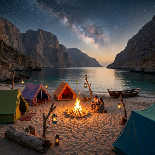 What's included in the experience:Dhow Cruise: Half-day cruise to the campsite with dolphin watching • Camp Setup: High-quality dome tents, sleeping mats, pillows, and blankets provided • Bonfire & BBQ Dinner: Traditional Omani grilled meats, vegetables, bread, salads, and soft drinks • Night Activities: Stargazing (Milky Way visible!), night fishing, and a peaceful fire-lit evening • Morning Routine: Sunrise over the fjord mountains, light breakfast, morning swim • Return Cruise: Morning cruise back with a second chance at dolphin spotting
